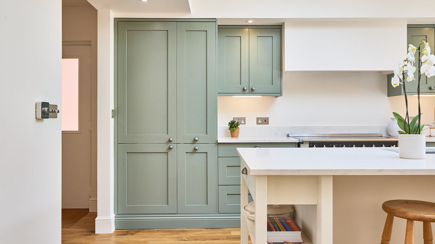 Nestled in the heart of Exeter, this charming green kitchen blends functionality with timeless design to meet the needs of a growing family.