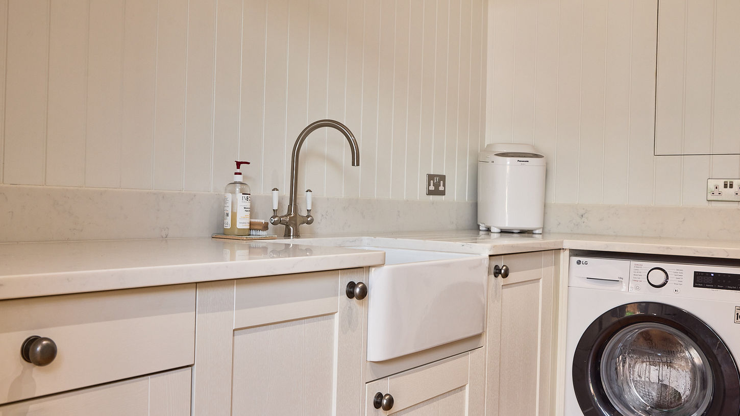 Just off the kitchen sits a beautifully coordinated utility room, finished in Belsay Porcelain. The classic Shaker-style doors and Quartz worktops keep the look light and fresh, while the Belfast sink adds a traditional touch. This space offers additional functionality for laundry, cleaning and overflow storage, making it a true extension of the kitchen and a great example of utility room inspiration.