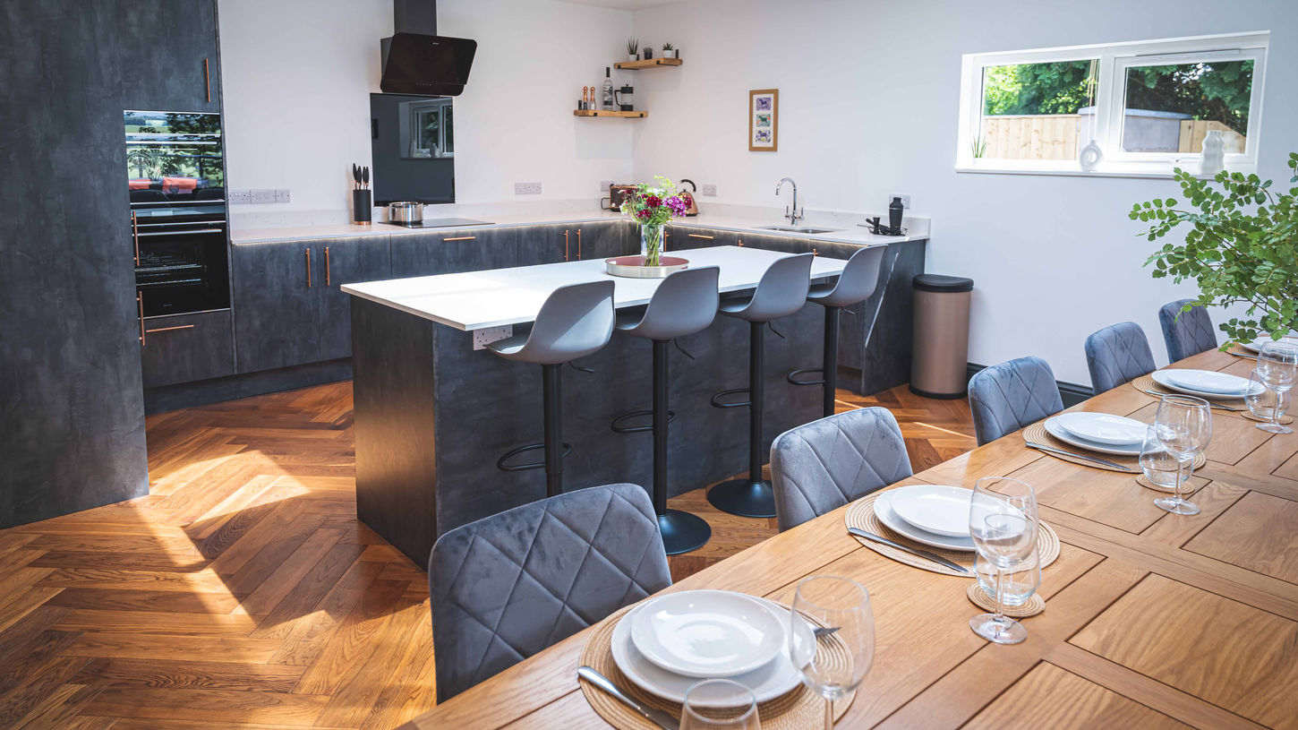 The vision for the kitchen at Three Oaks was to create a striking open-plan space enhanced by the perfect blend of colours and textures. It was also important that the materials used were sustainable and durable. The result, designed by Jack Woodcock, is a modern and sleek space characterised by the contrast between our textured Impressions Grey Slate door that is sourced from FSC-approved materials and the copper detailing in the handles and appliances. The Carrara Quartz worktops helped to further open up the space and perfectly compliment the parquet flooring.